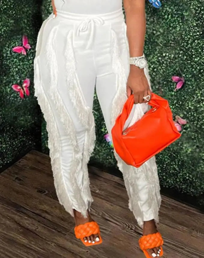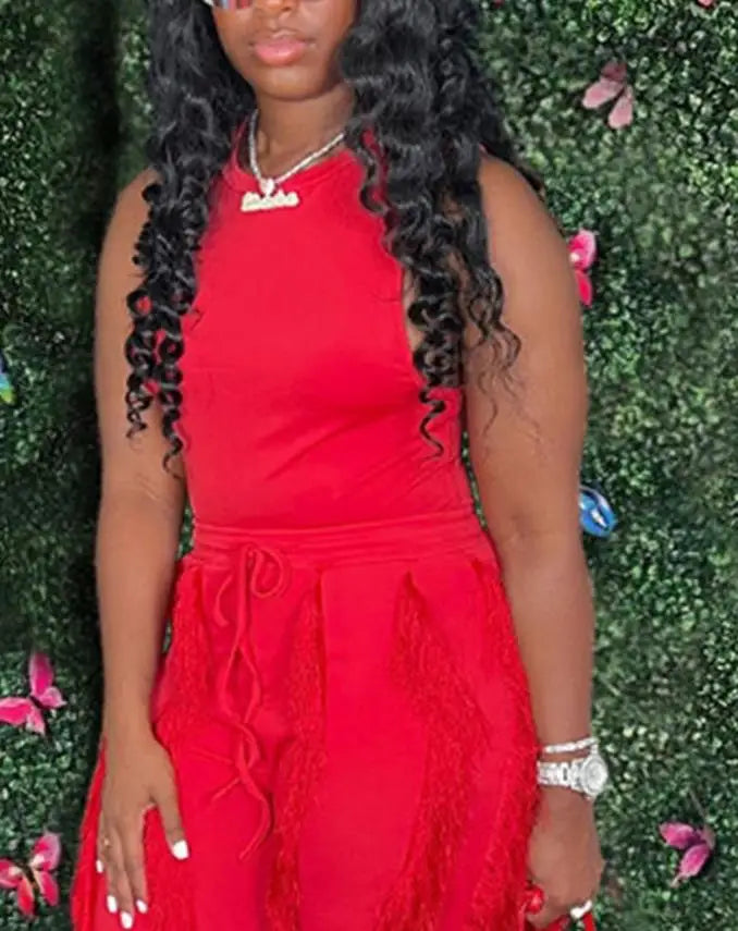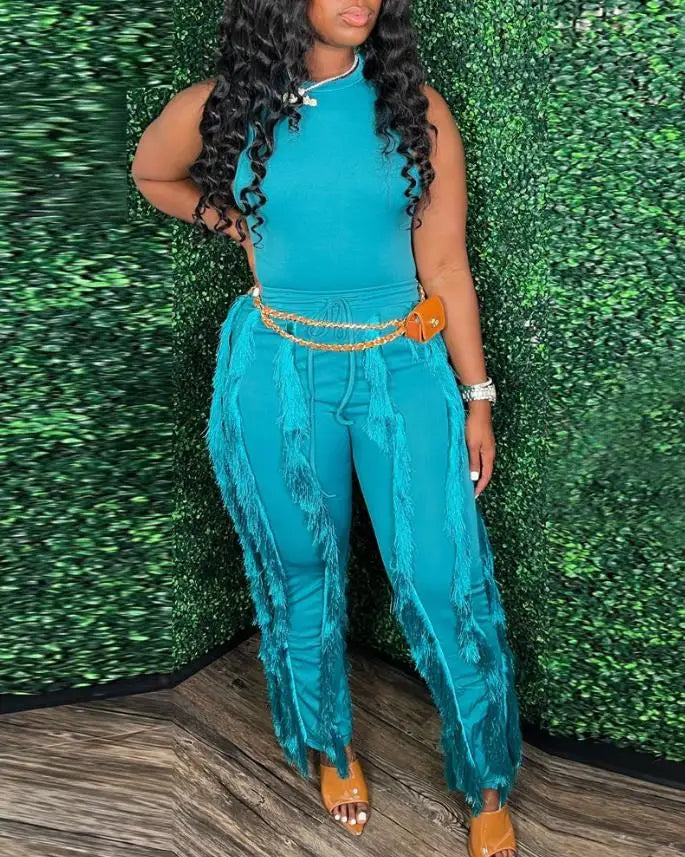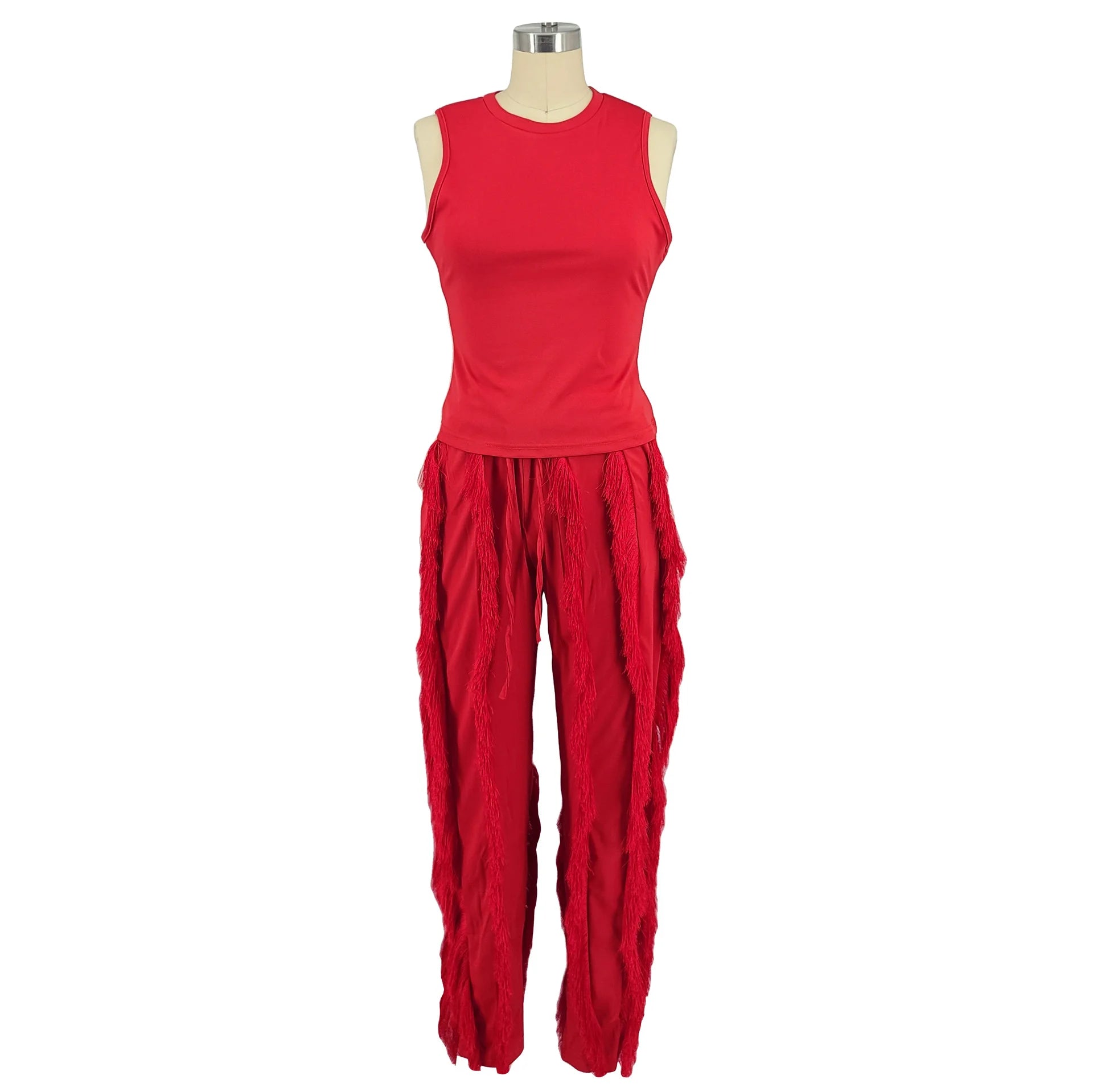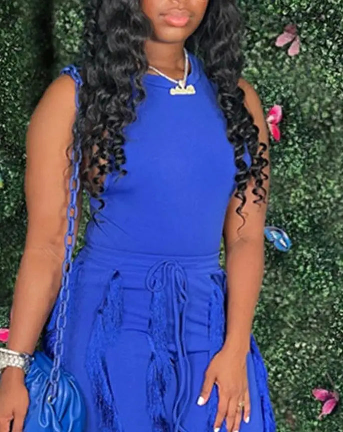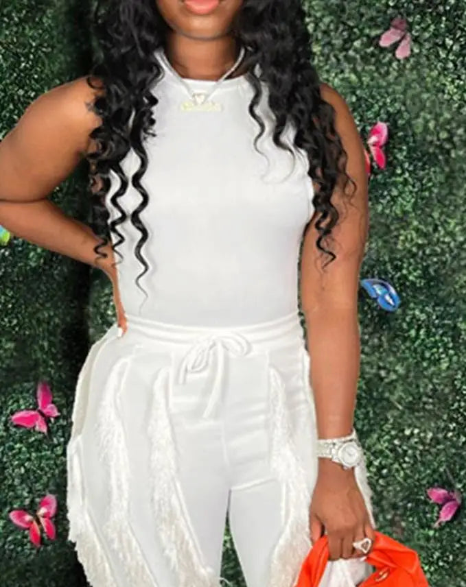 Fashion Solid Romper Casual Tank Top & Tassel Decor Drawstring Pants Set Skinny Tank Jumpsuits Summer Female Outfit Streetwear