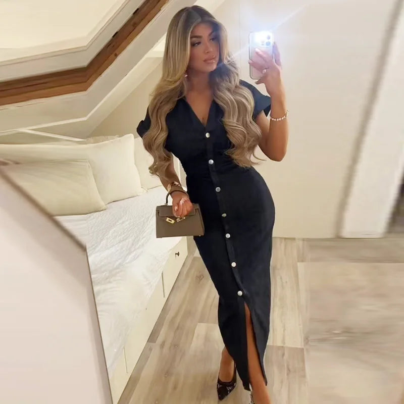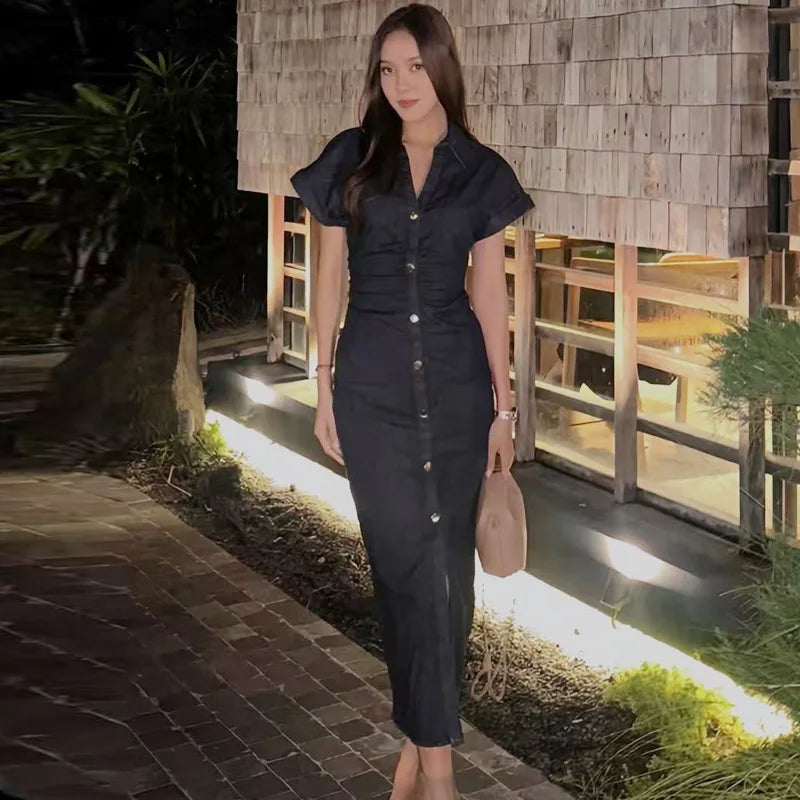 TRAF Womens Denim Dresses Summer 2025 Button Bodycon Blue Dress Ruffled Batwing Sleeve Long Dress Chic Casual Beach Vestidos 066