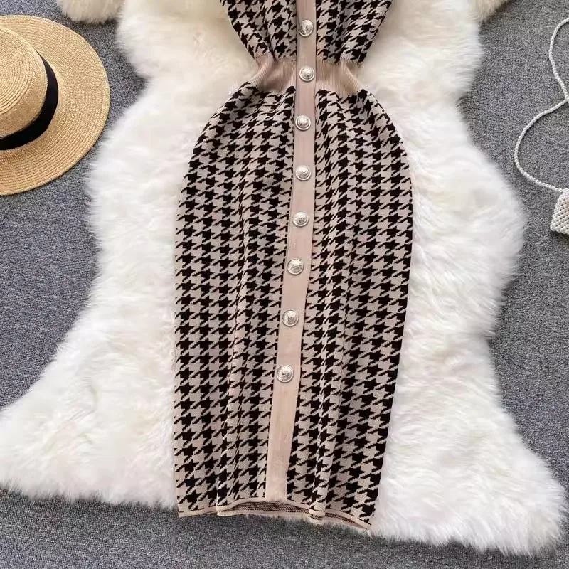 YuooMuoo Brand Fashion Houndstooth Knitted Long Dress 2024 Summer Fashion Vintage Elegant Office Lady Wrap Hips Bodycon Dress